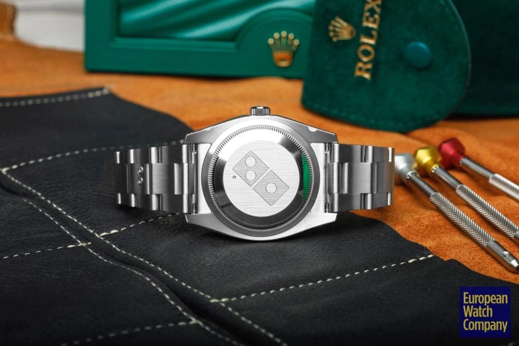 This particular example is a 2015 stainless steel Rolex Oyster Perpetual reference 116000 and is un-worn, with stickers, box, and papers measuring 36mm in diameter by 11.8mm thick. The Oyster Perpetual is a longstanding and foundational model for the brand representing the Rolex philosophy in its most distilled form. All Rolex watches—excluding the Cellini line—are built on the foundation of the Oyster Perpetual. This modern reference is the epitome of a go-anywhere do-anything timepiece, and despite the Domino's logo flies under the radar.