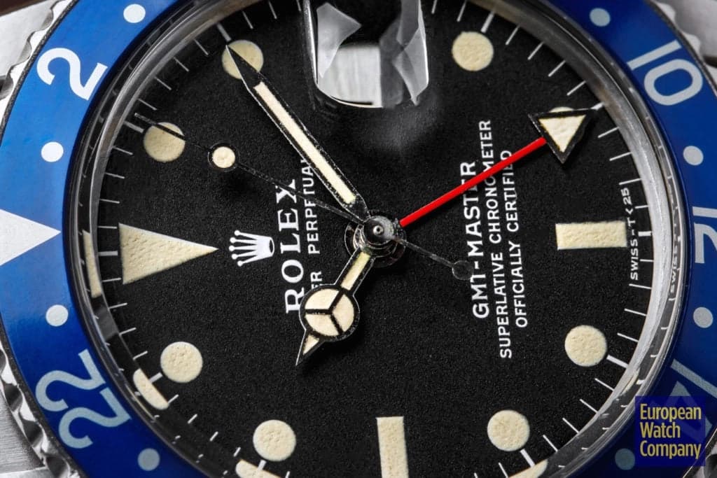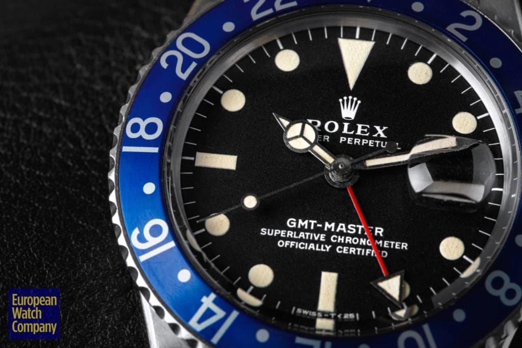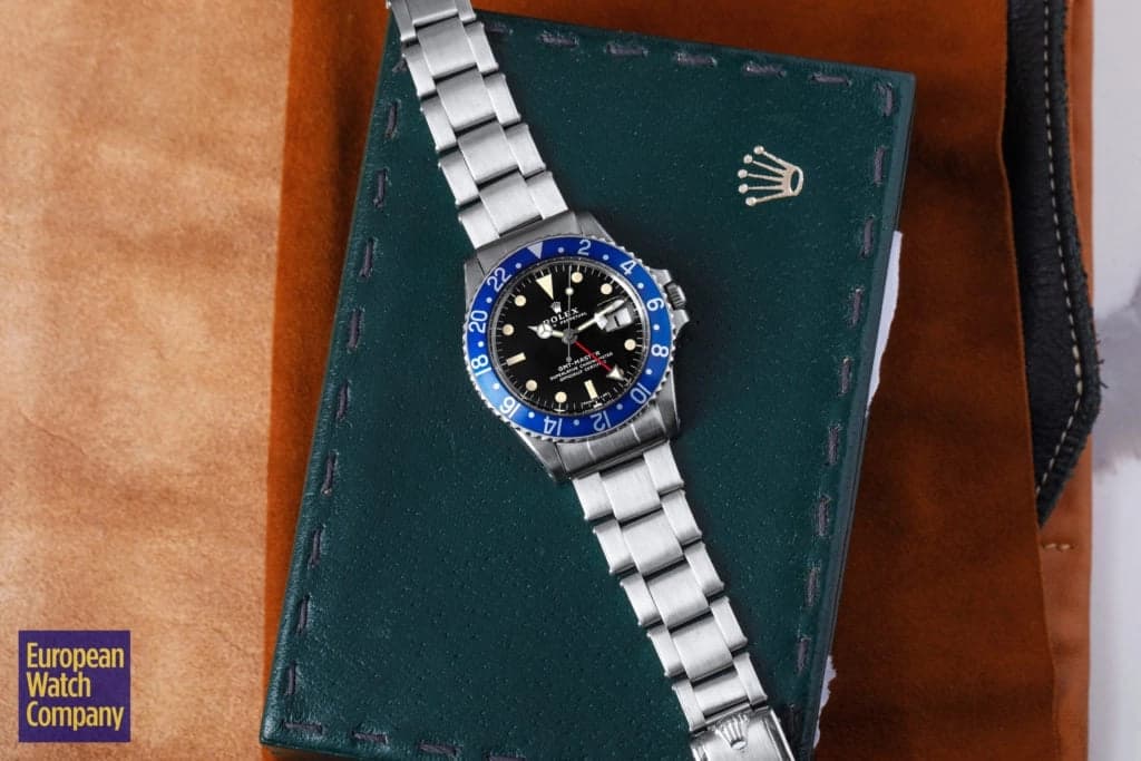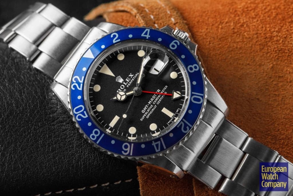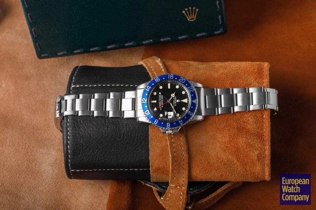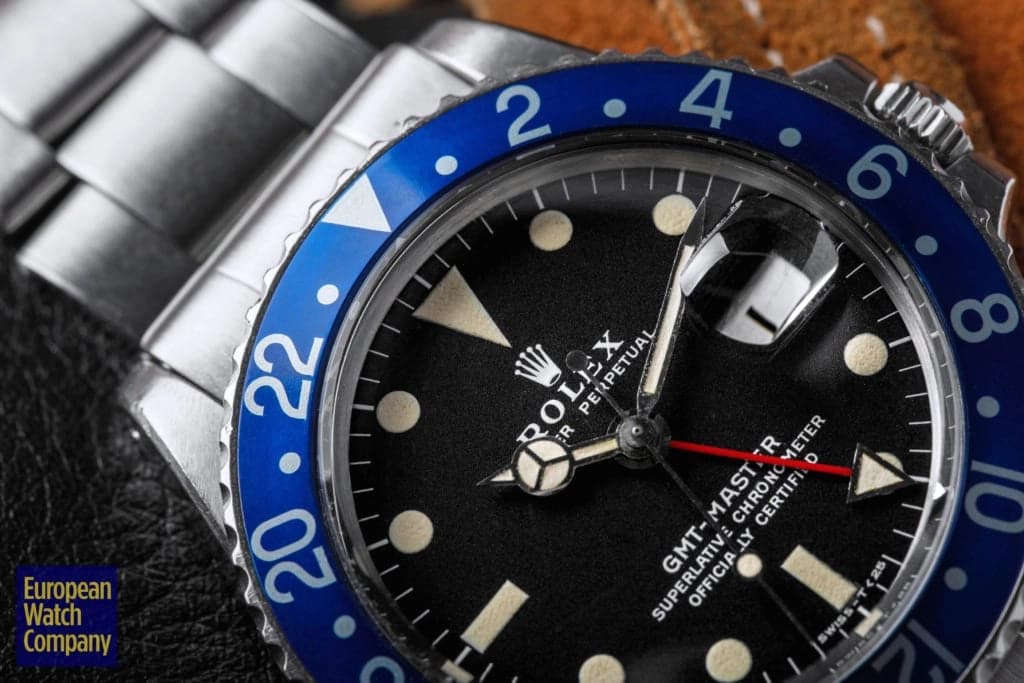 First, this all blue bezel was only made for the reference 1675 Rolex GMT-Master from the 1970s. This timing lines up with Rolex's introduction of all black bezels, so part of the thinking is that the blue bezels could have been an alternative single color bezel option that Rolex was trying out. The blue bezel has been found on Mark 2, 3, 4, and 5 dials. This specific example is a Mark 2, which you can tell by the wider "Rolex" font and logo as well as the closeness of the "LE." Most people also agree that the blue bezel was not a standard retail configuration for the GMT, but rather it was offered to clients by Rolex Service centers. It's also believed that the blue bezels may have been allocated specifically for military orders in the Middle East. There have been multiple co-branded United Arab Emirates GMTs that have these blueberry inserts, which helps back this theory. Additionally, there are small hallmarks like the font and an alignment notch on the back of these bezels that help when validating them. As always, using a trusted and reputable dealer—like, say, European Watch Company—is the best route to go when looking to buy the Blueberry or any vintage timepiece.