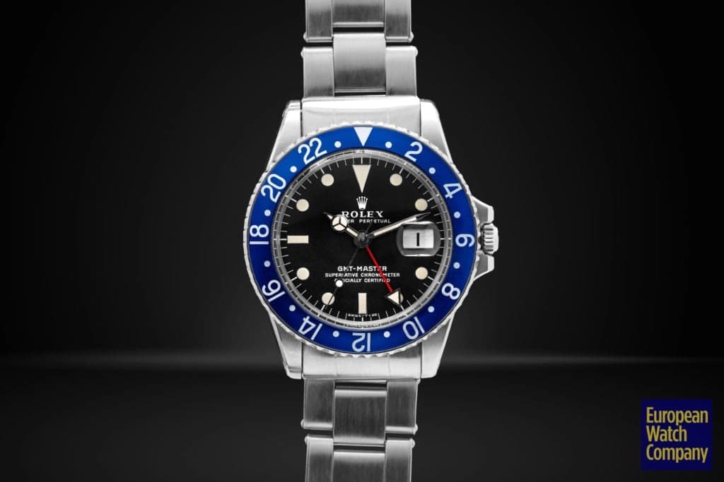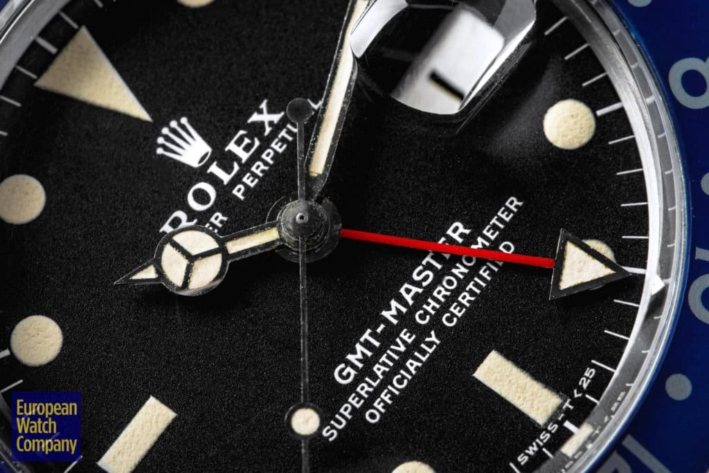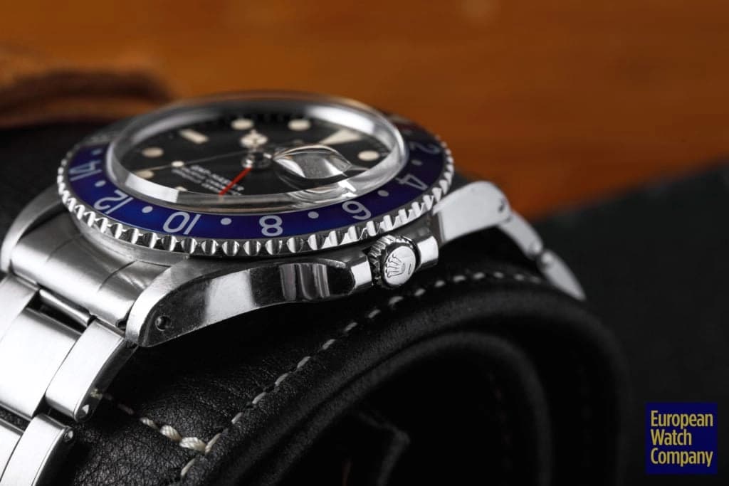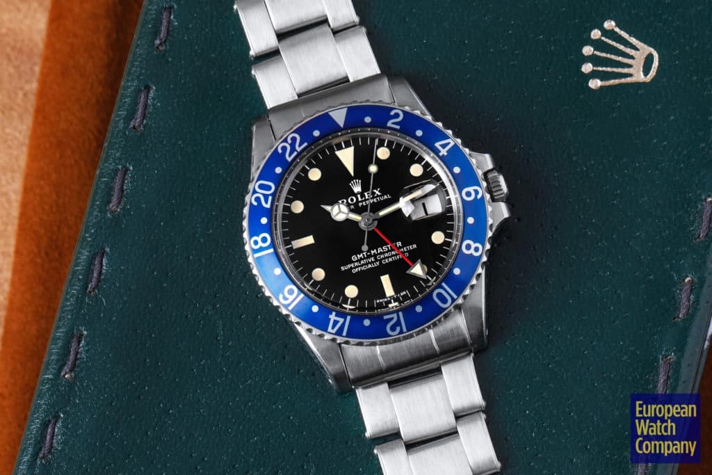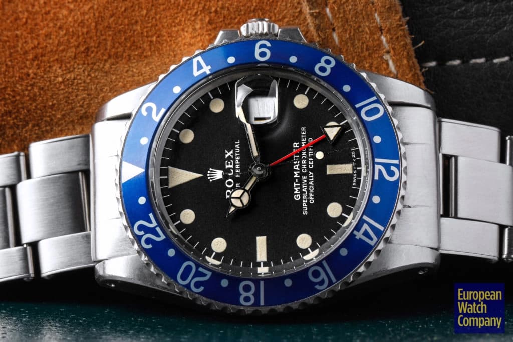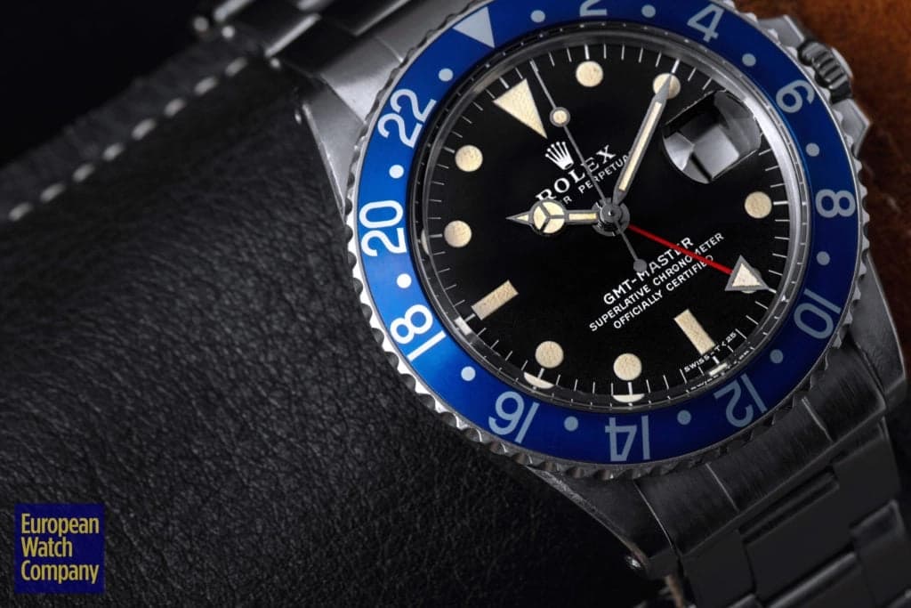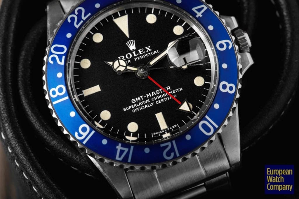 First, this all blue bezel was only made for the reference 1675 Rolex GMT-Master from the 1970s. This timing lines up with Rolex's introduction of all black bezels, so part of the thinking is that the blue bezels could have been an alternative single color bezel option that Rolex was trying out. The blue bezel has been found on Mark 2, 3, 4, and 5 dials. This specific example is a Mark 2, which you can tell by the wider "Rolex" font and logo as well as the closeness of the "LE." Most people also agree that the blue bezel was not a standard retail configuration for the GMT, but rather it was offered to clients by Rolex Service centers. It's also believed that the blue bezels may have been allocated specifically for military orders in the Middle East. There have been multiple co-branded United Arab Emirates GMTs that have these blueberry inserts, which helps back this theory. Additionally, there are small hallmarks like the font and an alignment notch on the back of these bezels that help when validating them. As always, using a trusted and reputable dealer—like, say, European Watch Company—is the best route to go when looking to buy the Blueberry or any vintage timepiece.