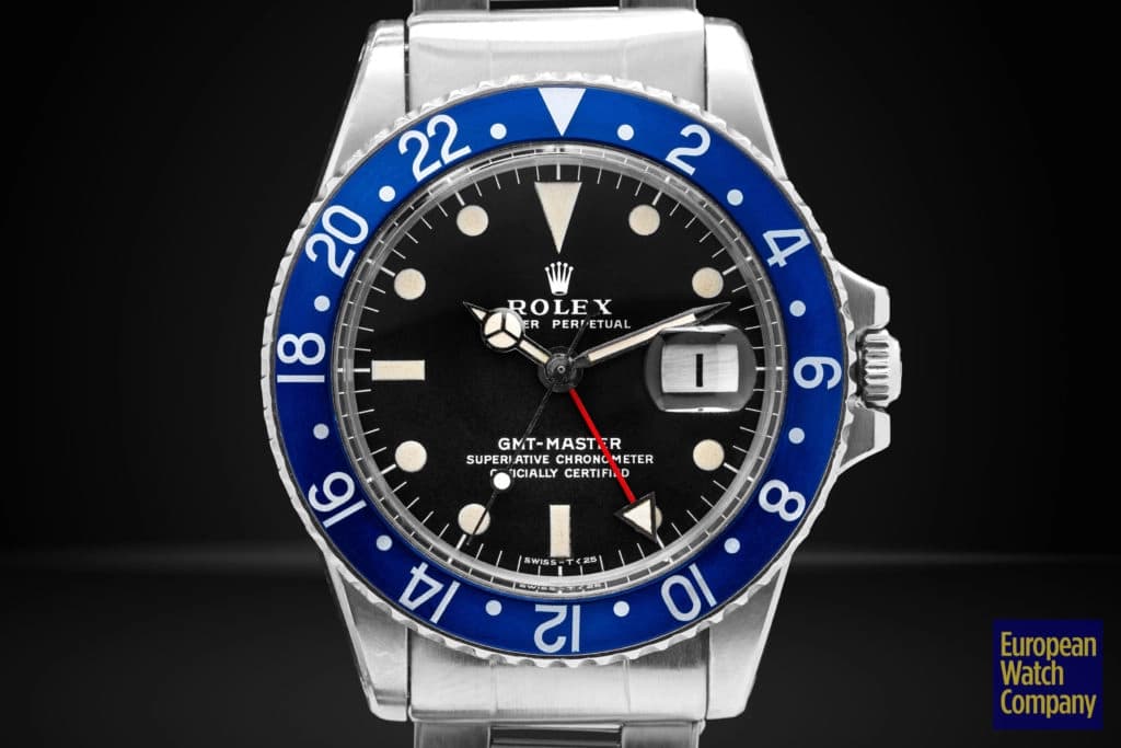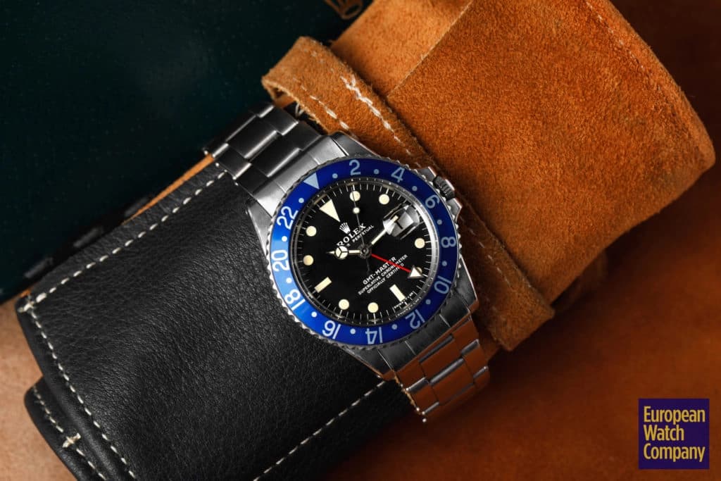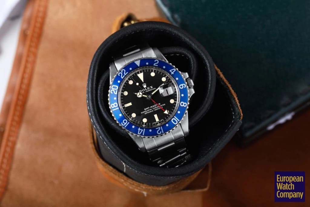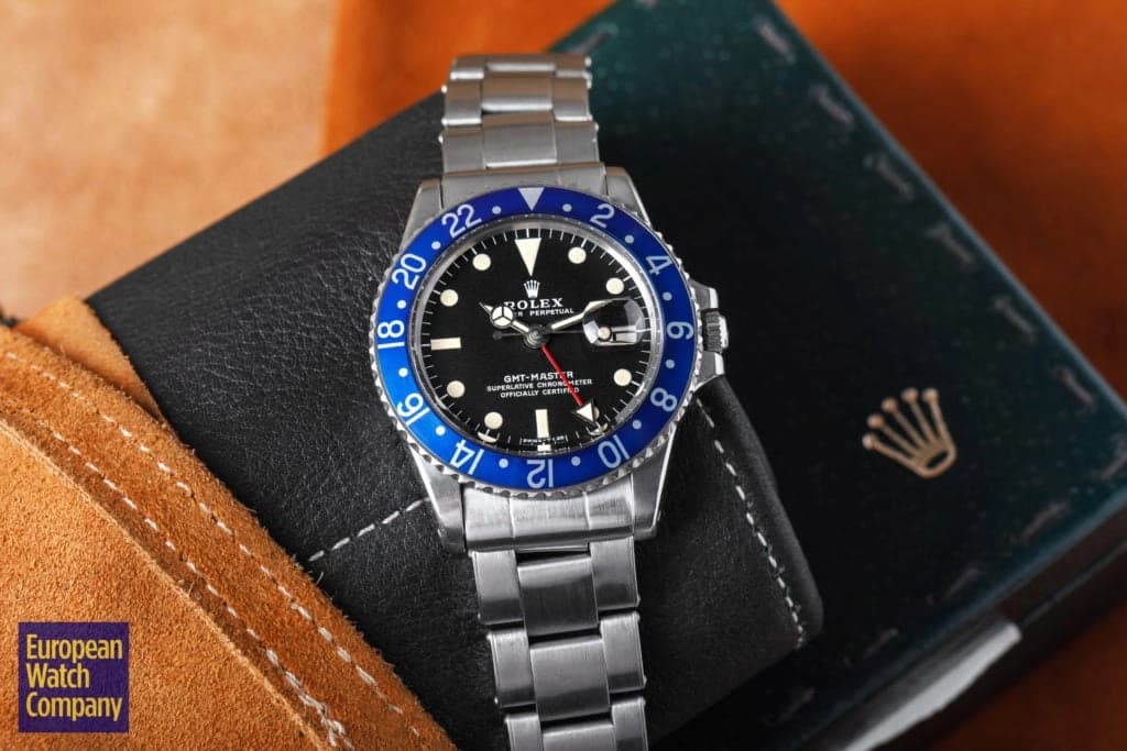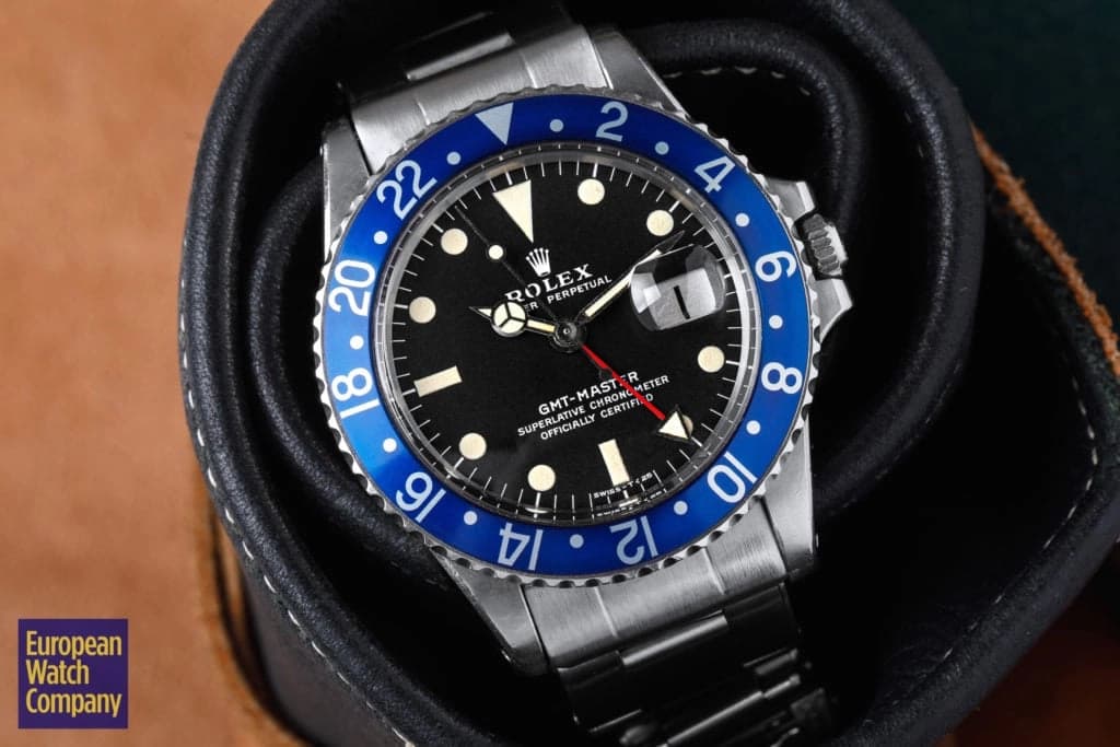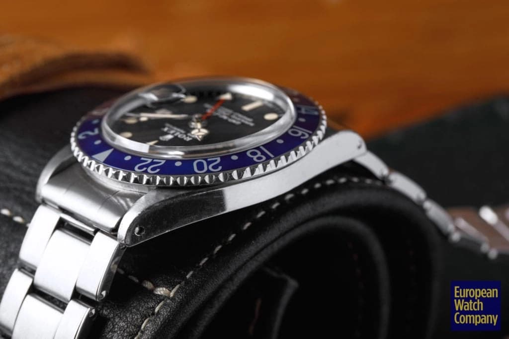 First, this all blue bezel was only made for the reference 1675 Rolex GMT-Master from the 1970s. This timing lines up with Rolex's introduction of all black bezels, so part of the thinking is that the blue bezels could have been an alternative single color bezel option that Rolex was trying out. The blue bezel has been found on Mark 2, 3, 4, and 5 dials. This specific example is a Mark 2, which you can tell by the wider "Rolex" font and logo as well as the closeness of the "LE." Most people also agree that the blue bezel was not a standard retail configuration for the GMT, but rather it was offered to clients by Rolex Service centers. It's also believed that the blue bezels may have been allocated specifically for military orders in the Middle East. There have been multiple co-branded United Arab Emirates GMTs that have these blueberry inserts, which helps back this theory. Additionally, there are small hallmarks like the font and an alignment notch on the back of these bezels that help when validating them. As always, using a trusted and reputable dealer—like, say, European Watch Company—is the best route to go when looking to buy the Blueberry or any vintage timepiece.