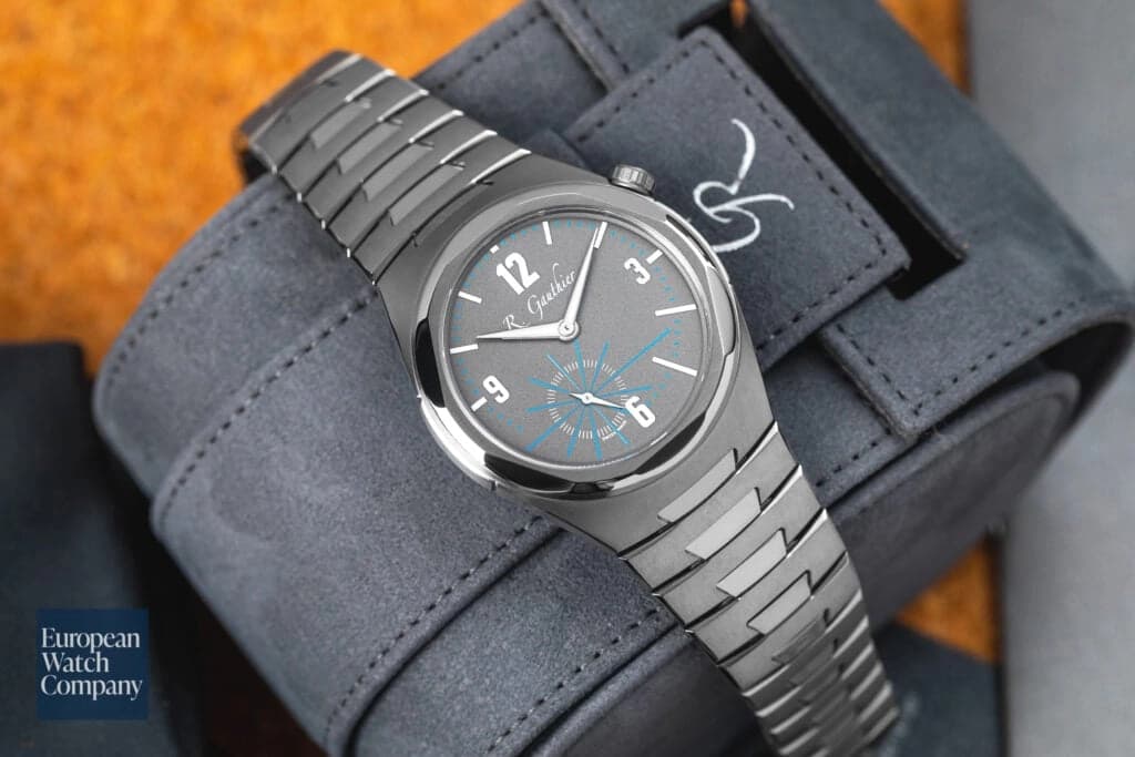 Based in the Vallee De Joux in Switzerland, Romain Gauthier is a prominent modern independent watchmaker known for unique design language and an extreme emphasis on hand-finishing. Gauthier watches feature a subtle blend of traditional watchmaking techniques mixed with modern materials (a common thread you may notice in the titanium watch highlights). The C by Romain Gauthier is one of the more notable pieces conceived by the brand. Featuring a full titanium case and titanium bracelet, the C also sports an explorer dial with a subsidiary seconds display and bright blue accents that pop on the gray dial. While the dial is tasteful and subtle, the in-house manual wind movement showcases Gauthier's signature balance wheel, a circular spoked ratchet wheel, and gears with beveled and polished angles. For a truly exotic independent creation from a rising star in the space, this is a fantastic offering.