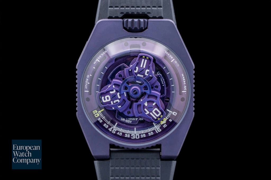If there’s a material that matches the hyper-modernist spirit of Urwerk, it has to be titanium. True to Zeitwerk form, the titanium case of the UR-100V Ultraviolet has been PVD coated in a striking shade of violet. In the world of high-end watches, bright colors are extremely rare and the way that this piece playfully incorporates some added character to a horologically sophisticated watch is incredibly refreshing.