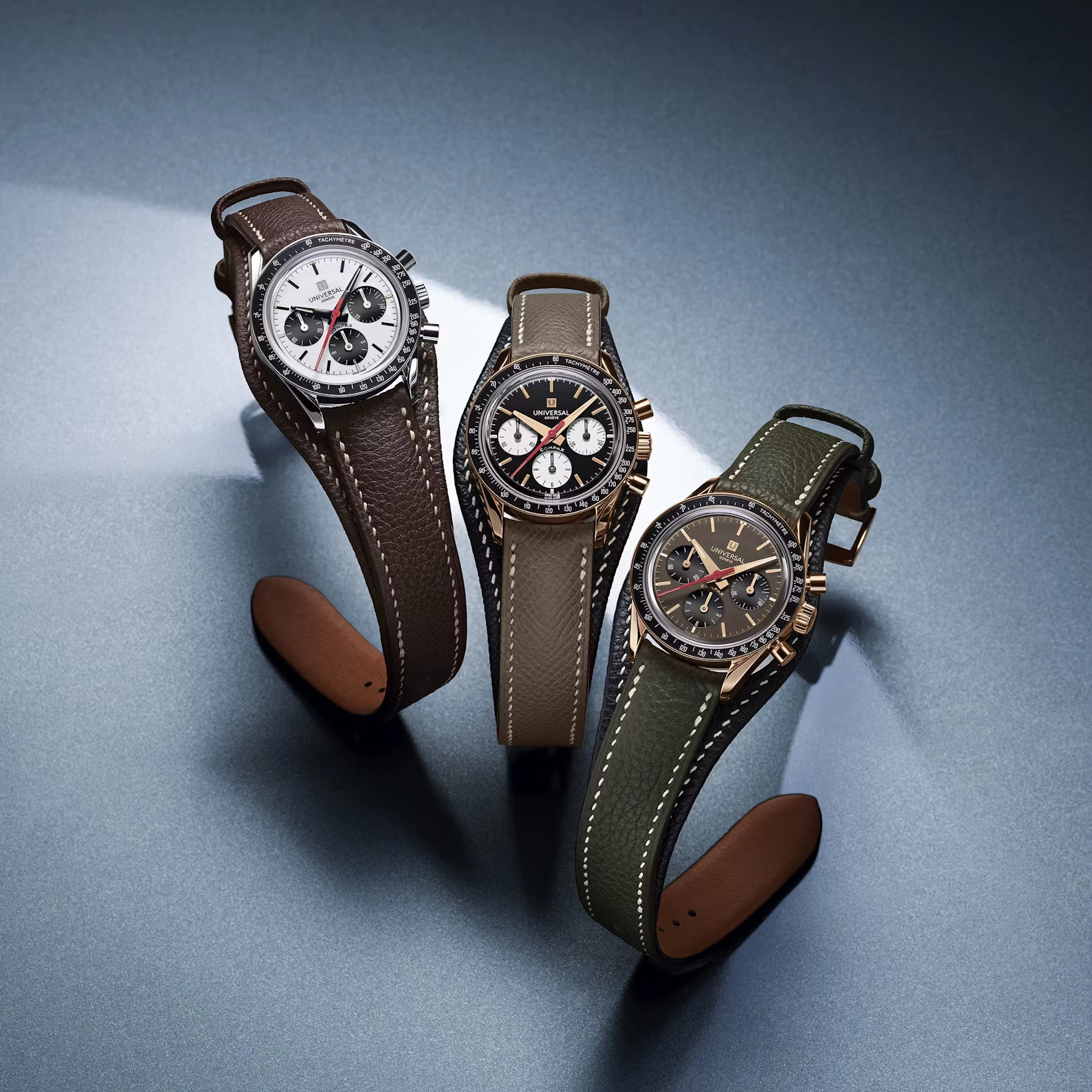 As part of the ramp up to its full relaunch in 2026, Universal Genève launches new models in tribute to a longtime collector favorite with their Tribute to Compax models. Vintage collectors have long sought after the original 1960s-era Compax models worn by Nina Rindt, the spouse of the late Formula 1 driver Jochen Rindt. Various versions, nicknamed “Nina” (white dial with black subdials) or “Evil Nina” (black dial with white subdials) by collectors, have now been reintroduced in a limited version of two sets of three watches. Each set has multiple dial variations of the classic three-register chronograph, with decidedly luxe touches like grand feu enamel dials and beautifully crafted leather bund straps made by renowned leatherworker Satoru Hosai, combined with a nod to the past with refurbished Universal Genève Caliber 281 movements. These sets are very exclusive, with only one of each set available on request, with the proceeds supporting apprenticeships at the Geneva Watchmaking School.