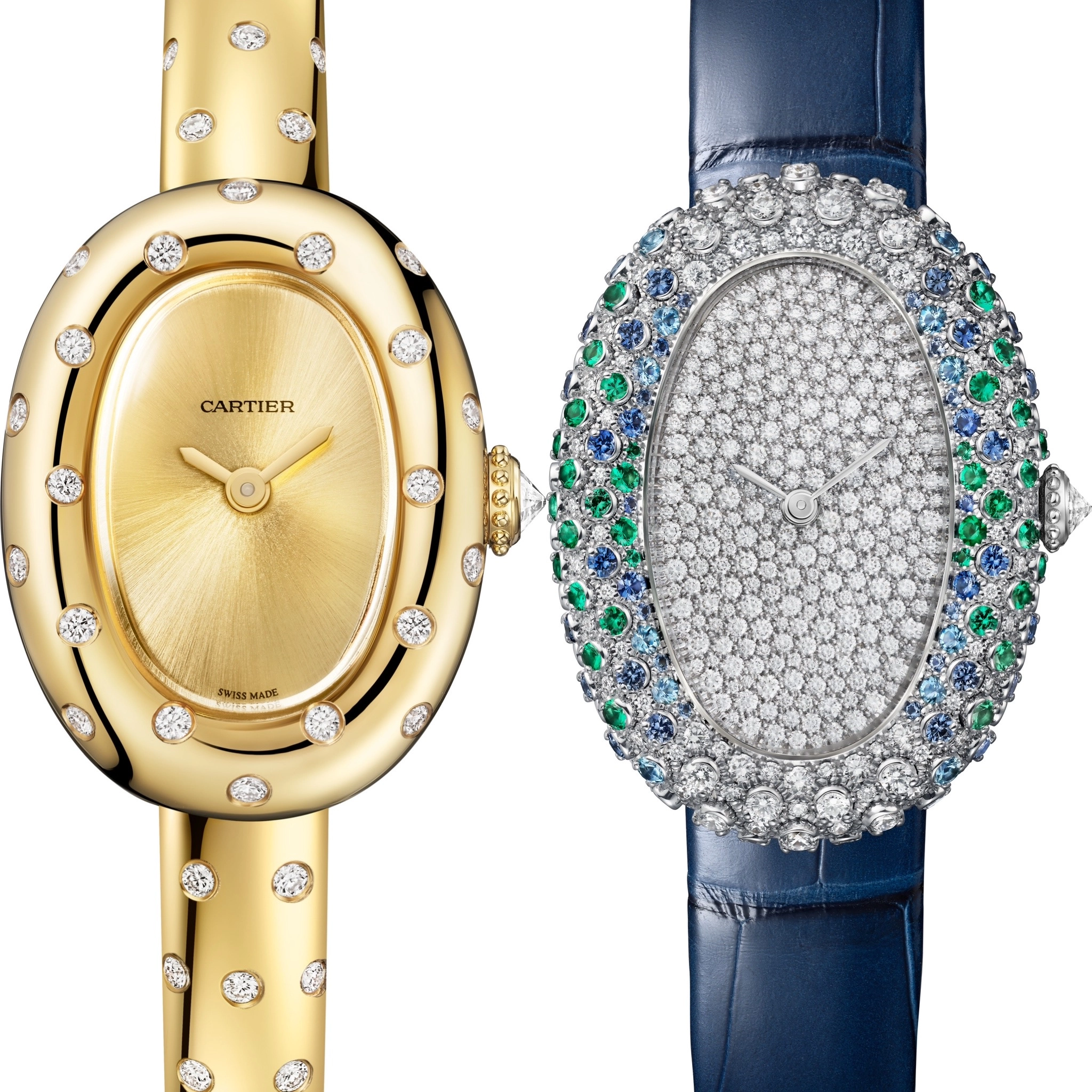 Cartier introduces 5 sparkling new versions of their classic Baignoire, three on straps and two on a bangle bracelet. One bangle version is a yellow gold aficionado’s fever dream, with a gold bangle, case, and golden dial, with 70 diamonds sprinkled throughout, while the other features a whopping 649 diamonds in total on the case, bracelet, and winding crown. The versions on straps are also quite eye-catching, with options ranging from a sleek mother-of-pearl dial accentuated by a gold case set with diamonds to a version with a diamond-set dial and a case set with a colorful combination of sapphires, emeralds, aquamarines, and diamonds.