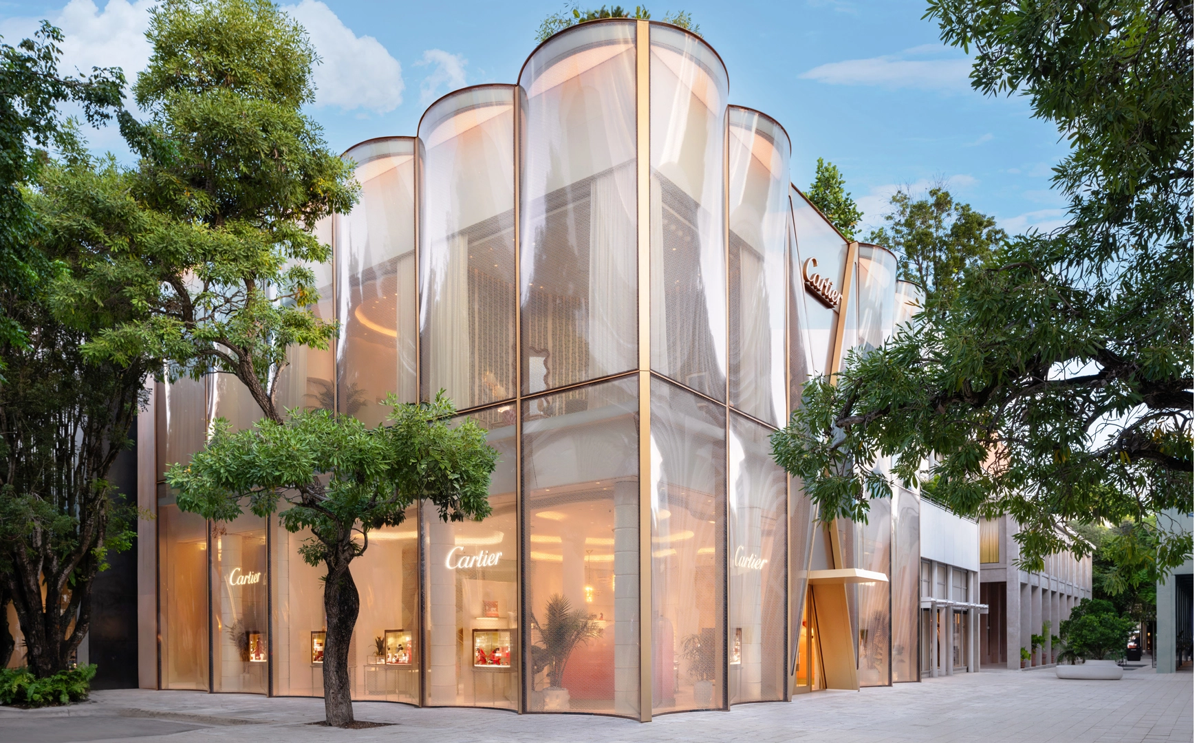 Cartier celebrates the reopening of its beautifully redesigned boutique in Miami’s Design District. With a visually exhilarating wraparound curved and etched glass façade that is intended to both integrate with its surroundings while drawing in the viewer, the two-floor interior of the boutique showcases the breadth of Cartier’s offerings with colorful nods to the vibrant city of Miami. It also features a rooftop terrace, taking advantage of the temperate climate and giving customers many spaces to explore.