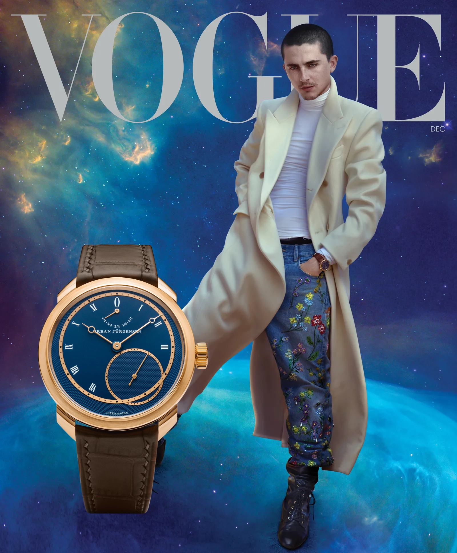Popular actor Timothée Chalamet was photographed by legendary photographer Annie Liebovitz for Vogue’s December 2025 cover. The cover features the star in a striking casual-meets-luxe outfit, accentuated by an Urban Jürgensen UJ-2 with a rose gold case and deep blue dial.