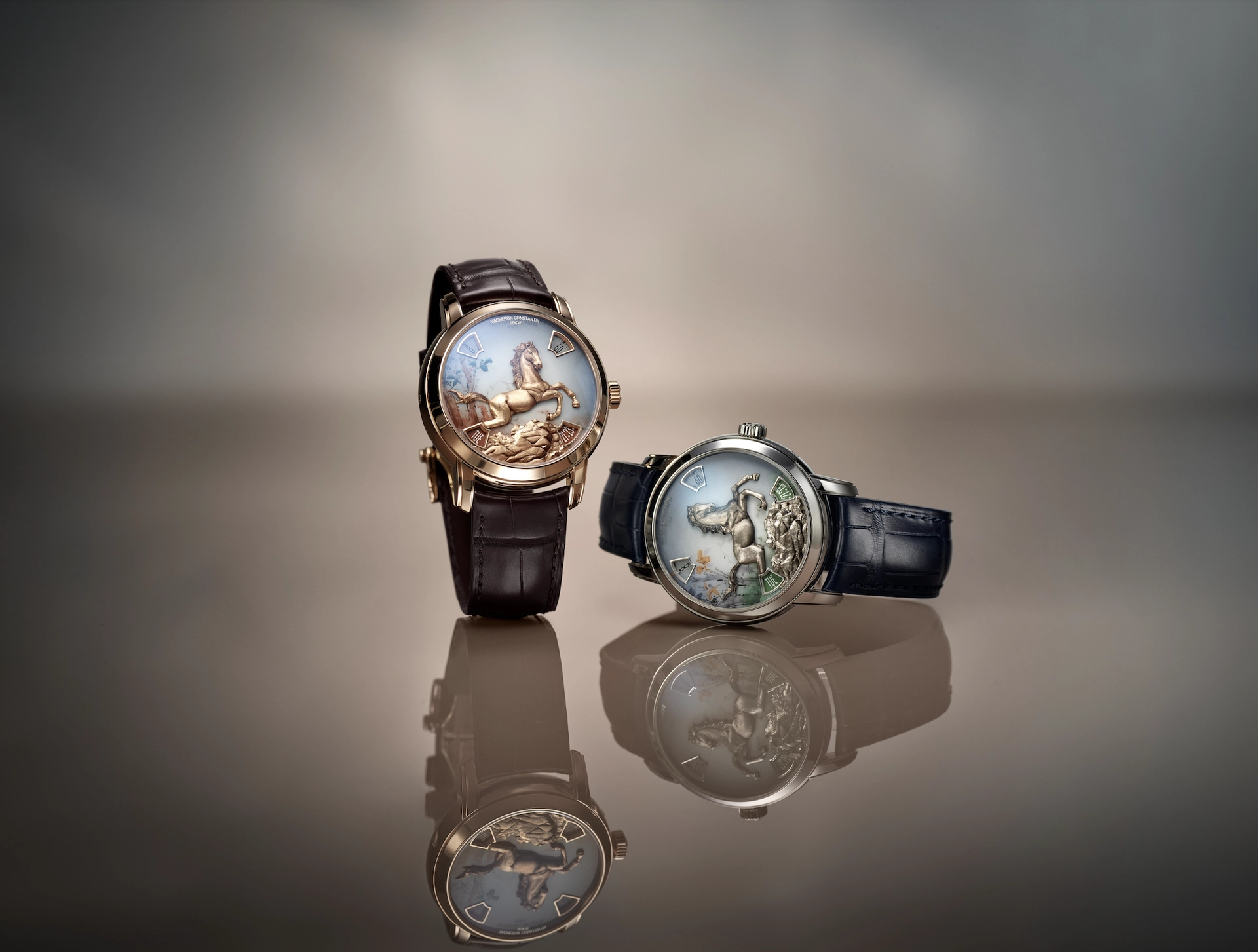 Vacheron Constantin debuts the latest addition to its Métiers d’Art The Legend of the Chinese Zodiac series with two limited editions celebrating the Sign of the Horse. These pieces are emblematic of Vacheron Constantin’s technical mastery with the automatic Calibre 2460 G4 while simultaneously displaying the artistic crafts of their metiers d’art specialists, who combine engraving, detailed micro-painting, and enameling on a dial featuring a horse that seems to gallop toward the wearer. One version is in pink gold and the other in platinum, with each version limited to 25 pieces.