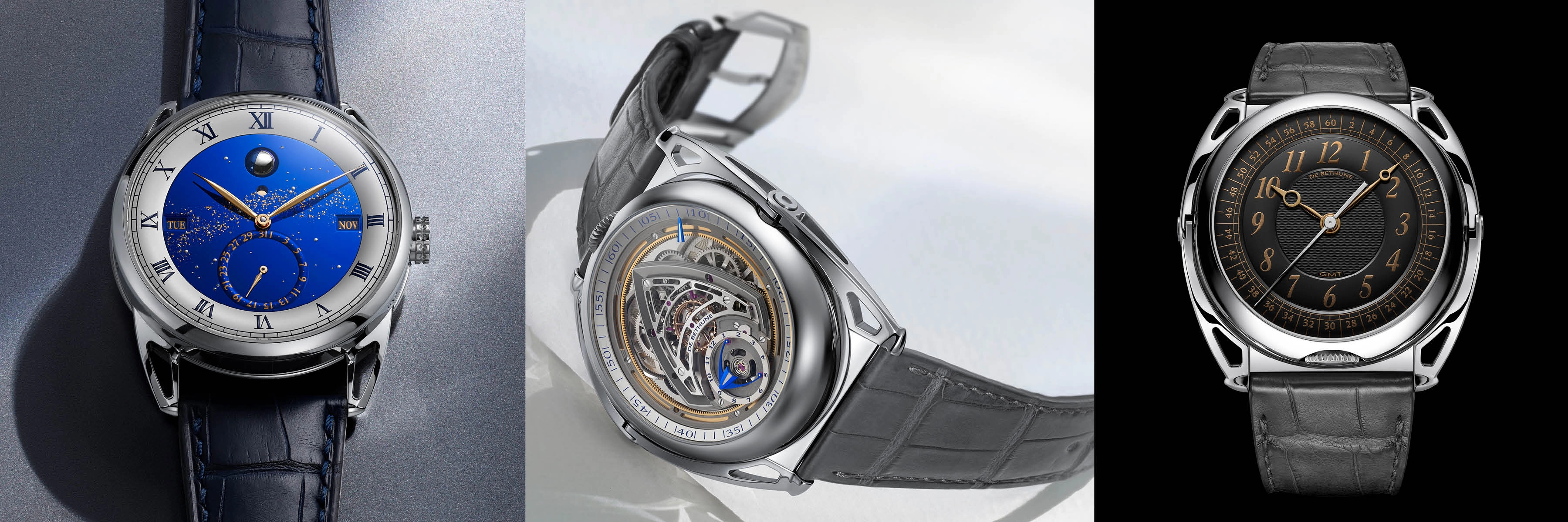 De Bethune introduced two new models, the DB Kind of Two Jumping GMT and the DB25 Perpetual Sky. The delightfully named Kind of Two is a double-sided timepiece that shows two different styles in a single watch, with one side showing a small hours display at the six o’clock position and the minutes around the outer track, and the other displaying a traditional classic dial layout and the second time zone. The DB25 Perpetual Sky is an updated version of De Bethune’s perpetual calendar, with a beautiful celestial dial displaying the time, day, date, month, and a moonphase display.