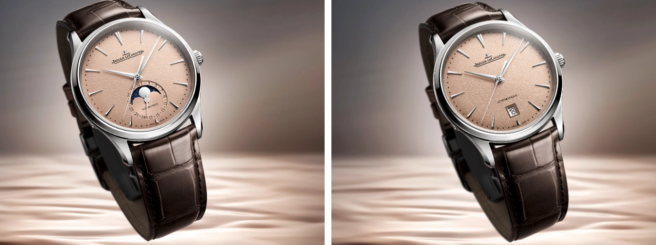 Expanding its Master Ultra Thin line, Jaeger-LeCoultre presented two new timepieces with shimmering copper dials, The Master Ultra Thin Moon and Master Ultra Thin Date. The subtle shade of copper contrasts nicely with the steel case, making both pieces versatile dress watches that could also be worn with a more casual ensemble. At the six o’clock position, the Date model has a small date window with a white date disc, and the Moon model has a combined date and moonphase display. The Master Ultra Thin Moon is powered by in-house Calibre 925 and the Master Ultra Thin Date is powered by Calibre 899, and both models are automatic.
