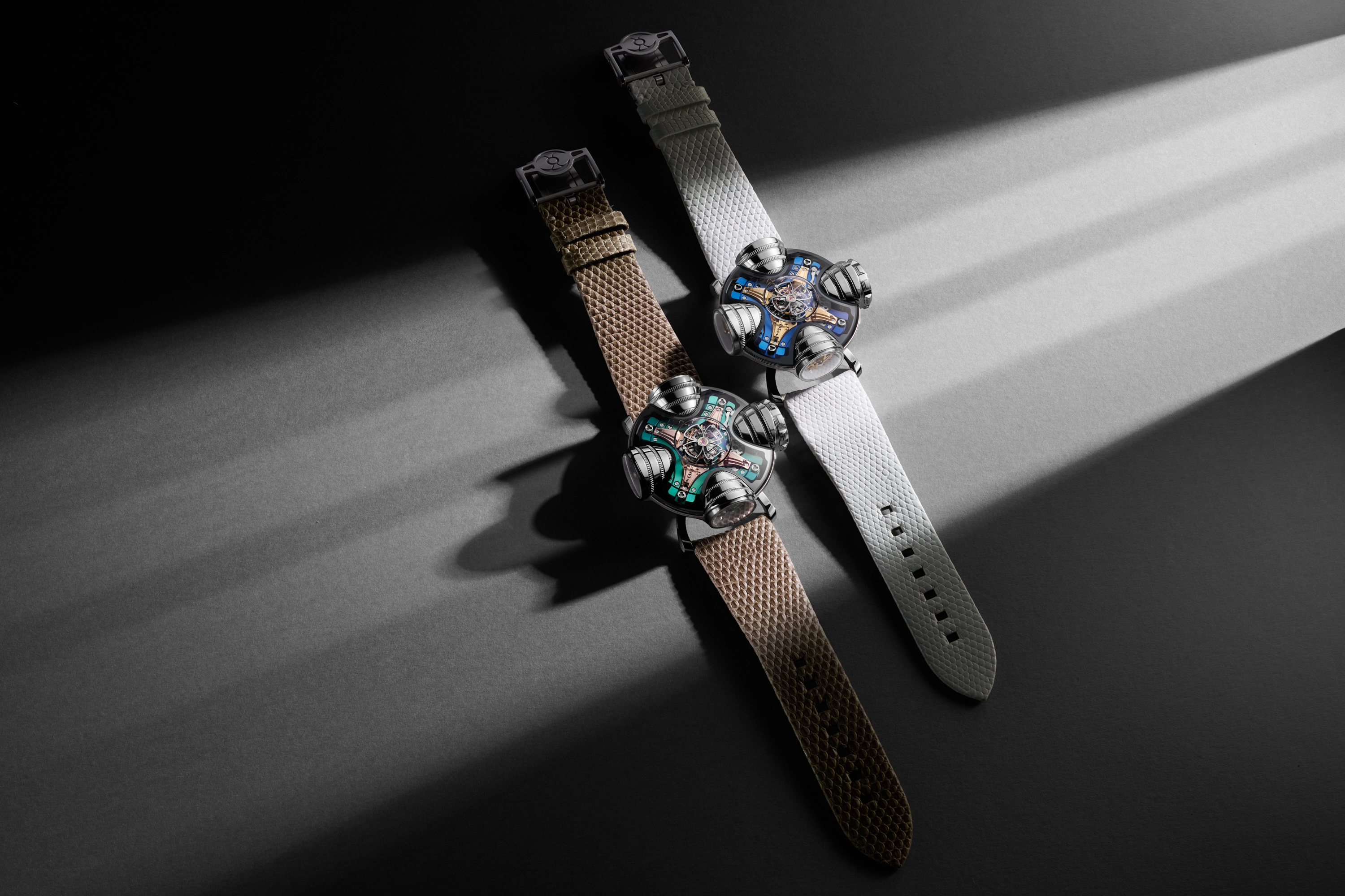 MB&F launched the new HM11 Art Deco, pulling inspiration from the Art Deco era to update its previous HM11 Architect with a fresh new look in two versions: a blue dial plate with 3N yellow-gold-tone bridges and a green dial plate with 5N rose-gold-tone bridges. Each is in a titanium case and has four different displays around the dial in individual “rooms”: a time setting module, time display, power reserve, and a mechanical thermometer, an unusually cool option rarely seen in a mechanical timepiece. Each version is limited to 10 pieces, for a total of 20 pieces to celebrate 20 years of MB&F.