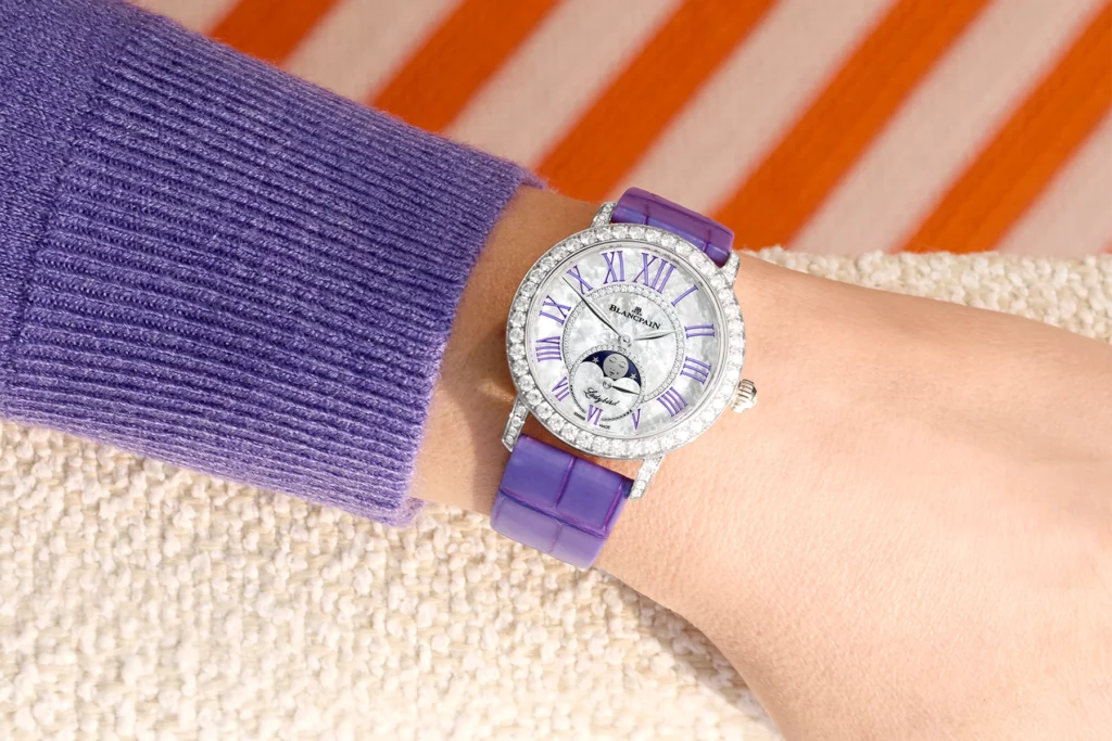 For the ladies, Blancpain has revealed its newest Ladybird line with the Royal Purple Capsule Collection. While H. Moser & Cie.’s rainbow Streamliner offers a beautiful example of gem setting, Blancpain leans even further into the realm of jewelry with a decoration of over two carats of diamonds coupled with a nacre perlee dial, a rare form of mother-of-pearl.