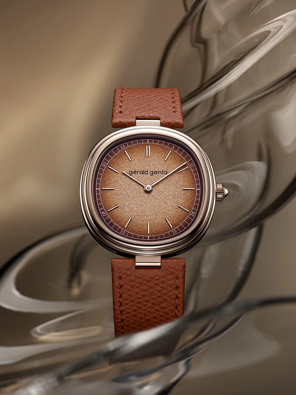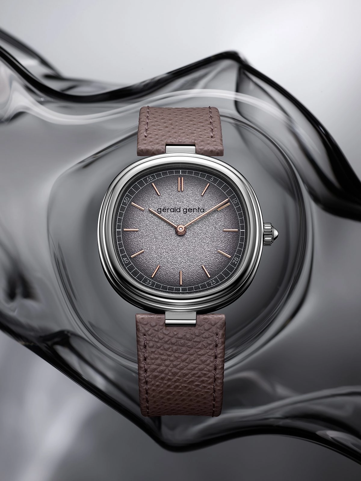 Gérald Genta announced two versions of the Gérald Genta Geneva Time-Only, decidedly uncomplicated watches that speak to the design language of the legendary timepiece designer. The Grafite has a white gold case and coordinated dark grey textured dial on a gray strap, while the Marrone version has a rose gold case with a tonal warm rosy-brown dial and a brown strap. Both are 38mm and are powered by the Zenith Elite GG-005P automatic movement, which has a 50 hour power reserve.