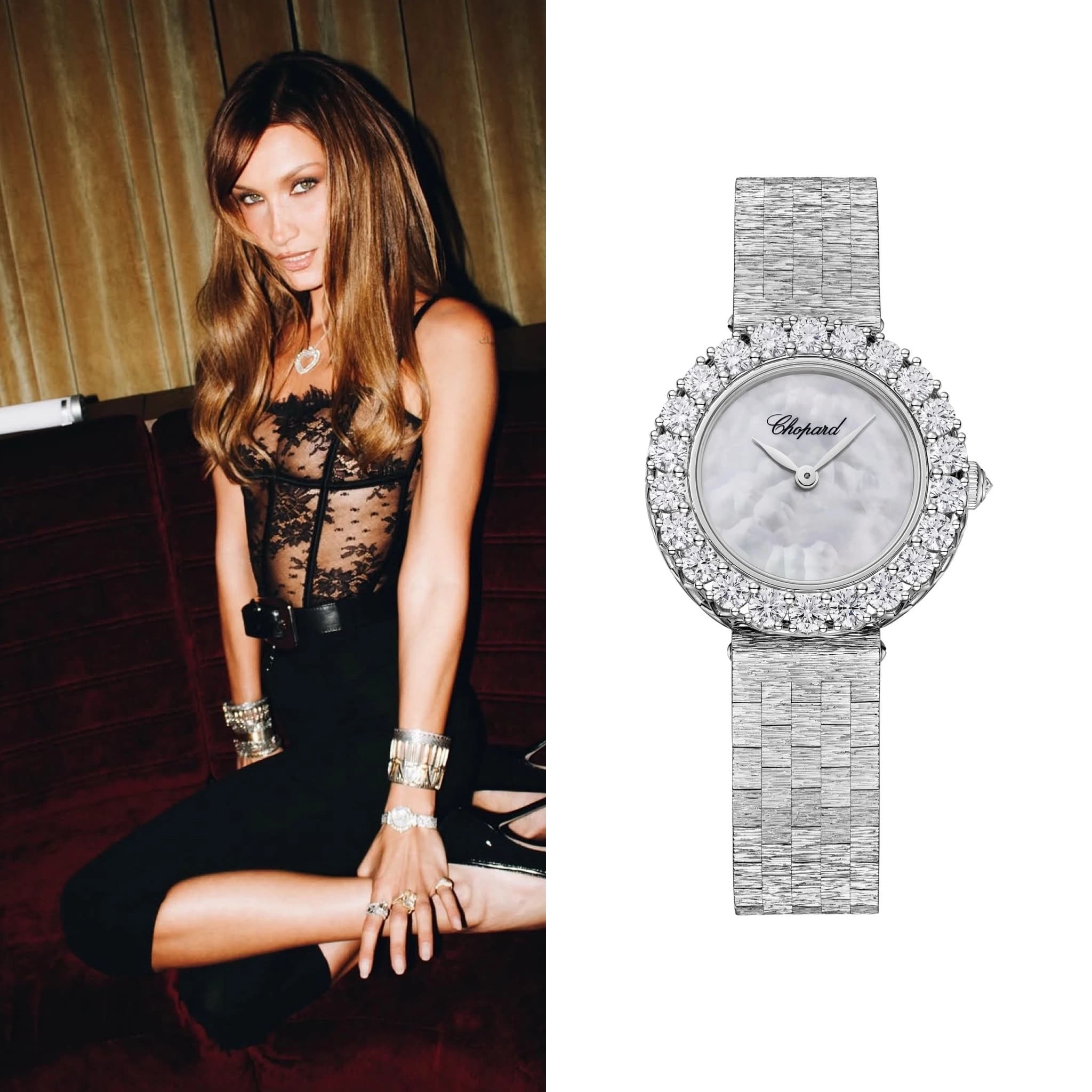 Chopard global ambassador Bella Hadid wore a Chopard L’heure du Diamant at the launch party for Revolve in Los Angeles. She wore it stacked with several bracelets and sported additional Chopard jewels throughout the event.