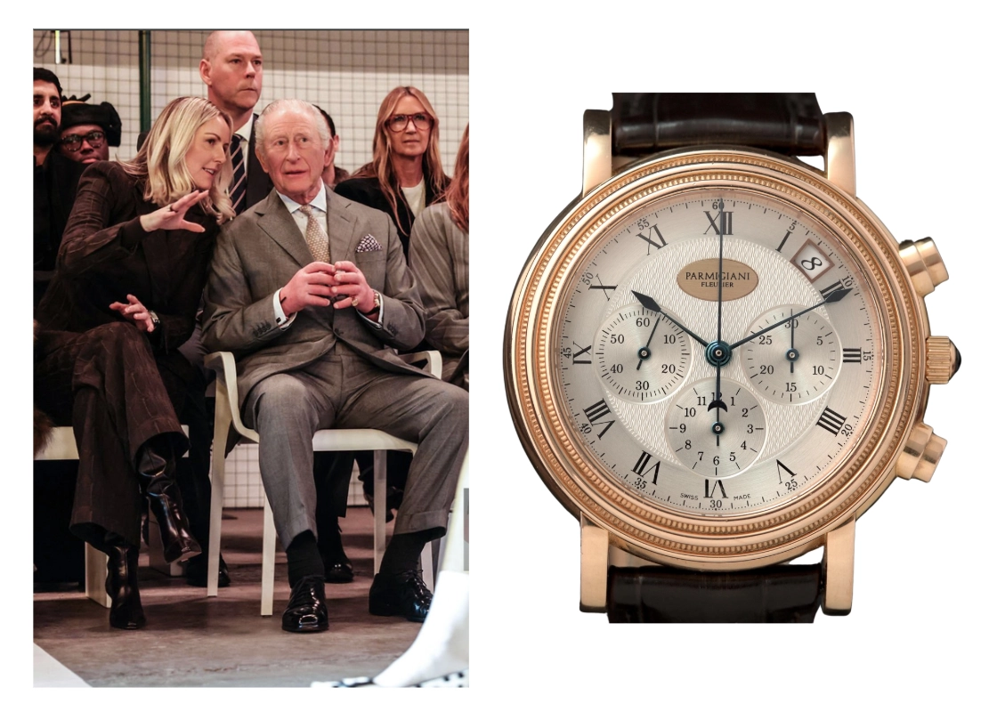 King Charles III was spotted wearing an early Toric Chronograph watch by Parmigiani Fleurier while attending British-Nigerian Designer Tolu Coker's show at the start of London Fashion Week. The King has been seen in this 39mm automatic watch on multiple occasions, including the wedding of Prince Harry and Meghan Markle in 2018.