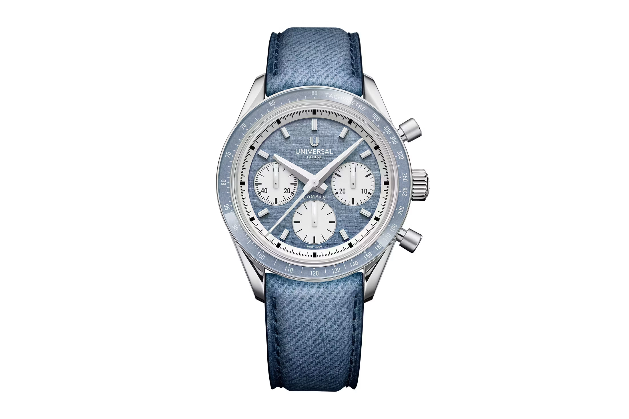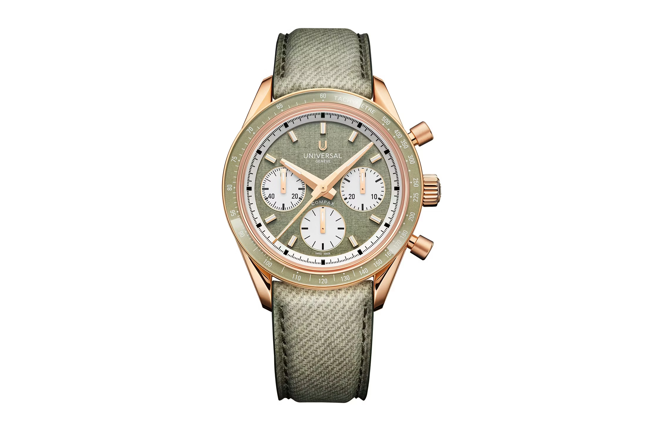 The Compax, another storied icon of Universal Geneve’s past, comes in six models - three in the core Prêt-à-Porter line with white, black, or midnight blue lacquered dials, and three in the Capsule collection with a linen-textured lacquered dial in a choice of lavender, sage green, or indigo. All of the Compax models have 39.5mm cases in either steel or rose gold, with 100m of water resistance and an in-house Caliber UG-200 column-wheel chronograph with hours, minutes, running seconds, and 1/4th second, 30-minute and 12-hour totalizers.