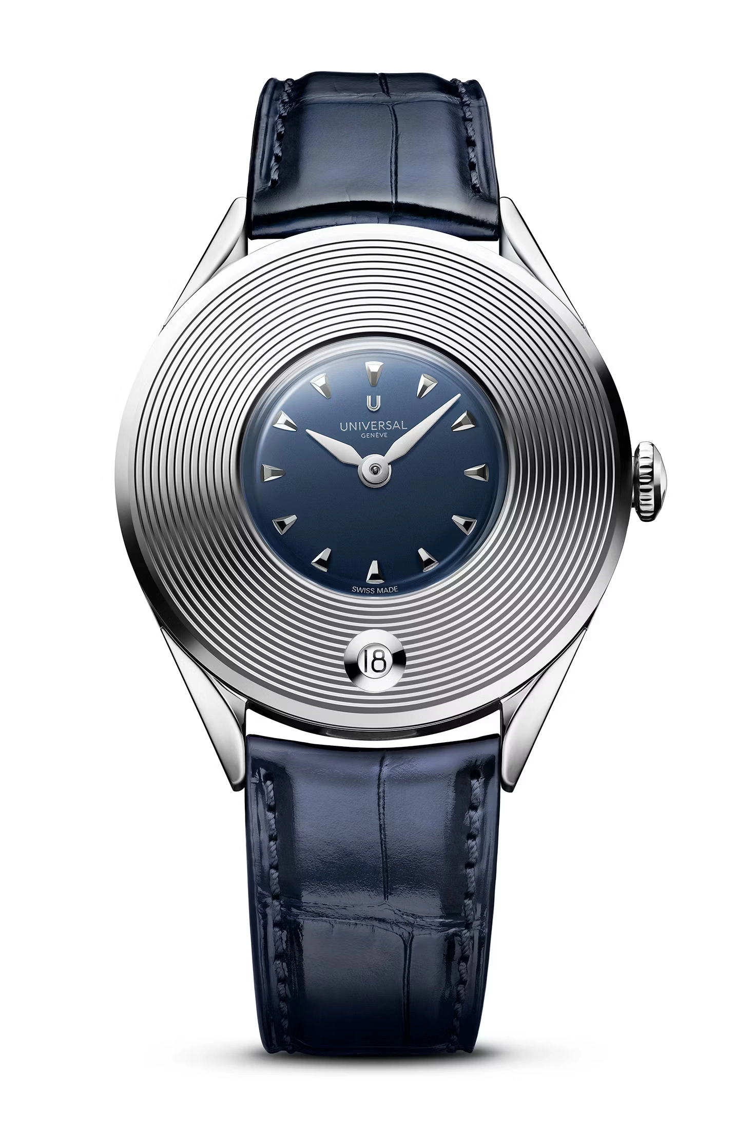 The Dioramic, in a 37mm case, has a striking and distinctive concentric fluted bezel that flows into its polished twisted lugs, with the bezel taking up much of the real estate on the dial side. The rose gold version has a black lacquered dial, while the steel version has a blue lacquered dial, and both feature a small cutout date window at the six o’clock position on the mesmerizing bezel. Both are powered by the in-house twin-barrel automatic Calibre UG-110, which features a micro-rotor.