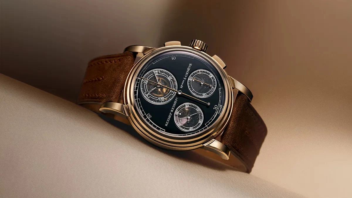 Rexhep Rexhelpi released his first eponymous chronograph, the Rexhep Rexhepi Chronograph Flyback, or RRCHF. The timepiece has a new in-house manually-wound movement with asymmetrical movement architecture that was intended to create a slim silhouette, resulting in a case thickness of only 9.7mm. It features a flyback chronograph, a jumping-minute counter, and an unconventional dial layout with hours and minutes displayed on an off-center subdial at the twelve o’clock position, running seconds at four o’clock, and minute counter at seven o’clock. The seconds hand is at the center of the dial, running along the outer track that marks the seconds. A grand feu enamel dial, smoked sapphire counters, and exhibition caseback offering a full view of the expertly finished movement round out the beauty of this piece.