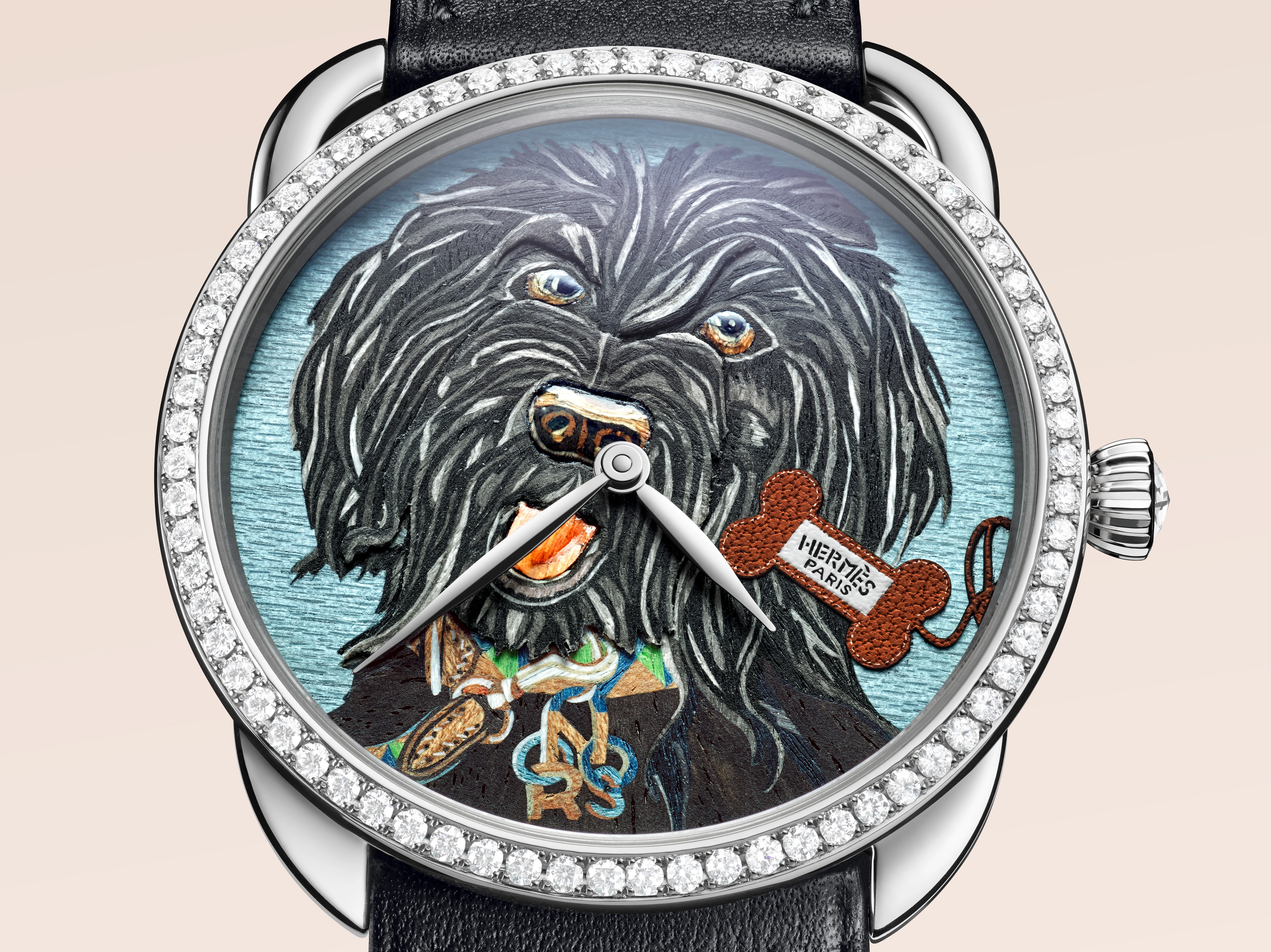 In conjunction with the exhibition, Hermès released three new Arceau Jour de Casting watches featuring charming portraits of dogs and displaying expertise in wood marquetry, engraving, miniature hand-painting, and enameling.
