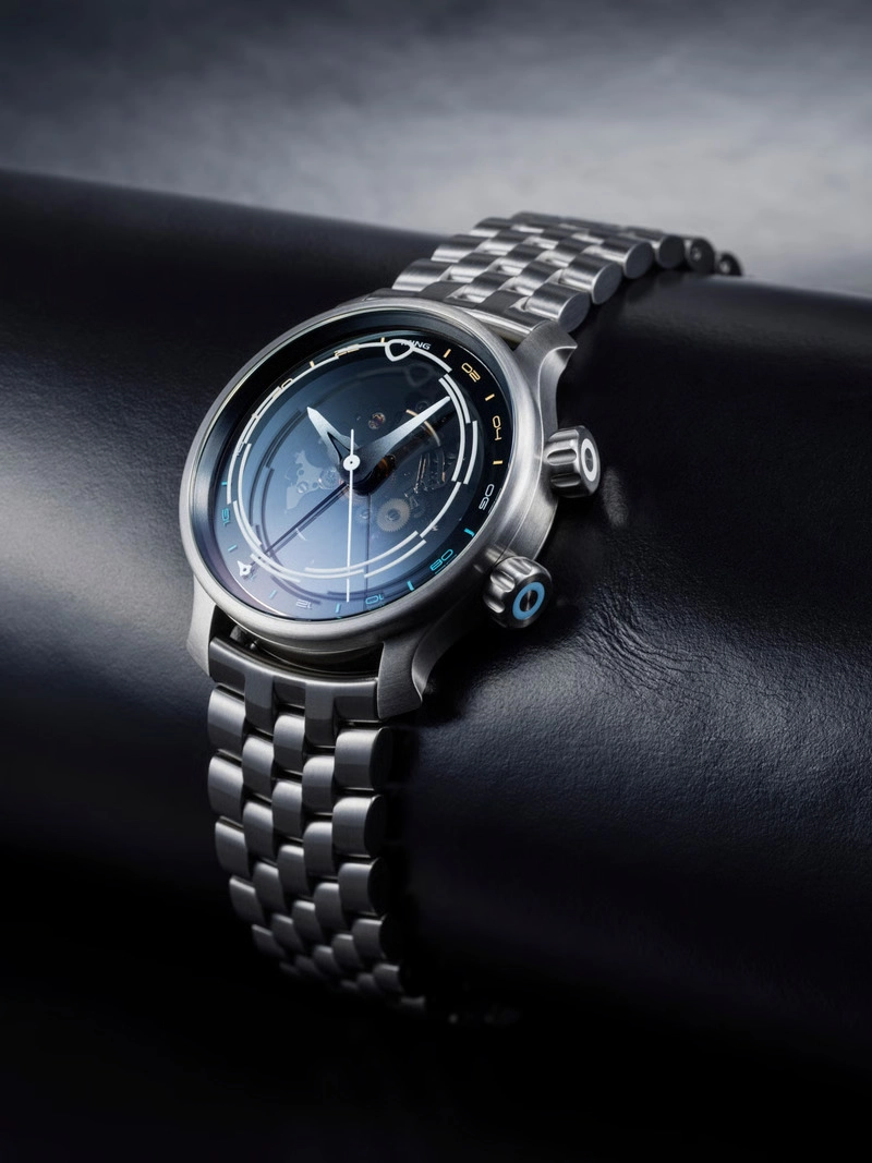 With its grade 2 titanium case, the 37.11 Odyssey is incredibly lightweight at only 42 grams for the case itself, and also features a bidirectional rotating dial with 24 timezones. The time can also be set underwater, for those who spend a lot of time swimming while traveling, and there are multiple sources of lume on the indices, crown, hands, and day/night indicator, assuring legibility no matter where or when you find yourself in your travels. It comes with three different strap options: rubber, integrated bracelet, or their own Polymesh, allowing the wearer to personalize it to their own liking.