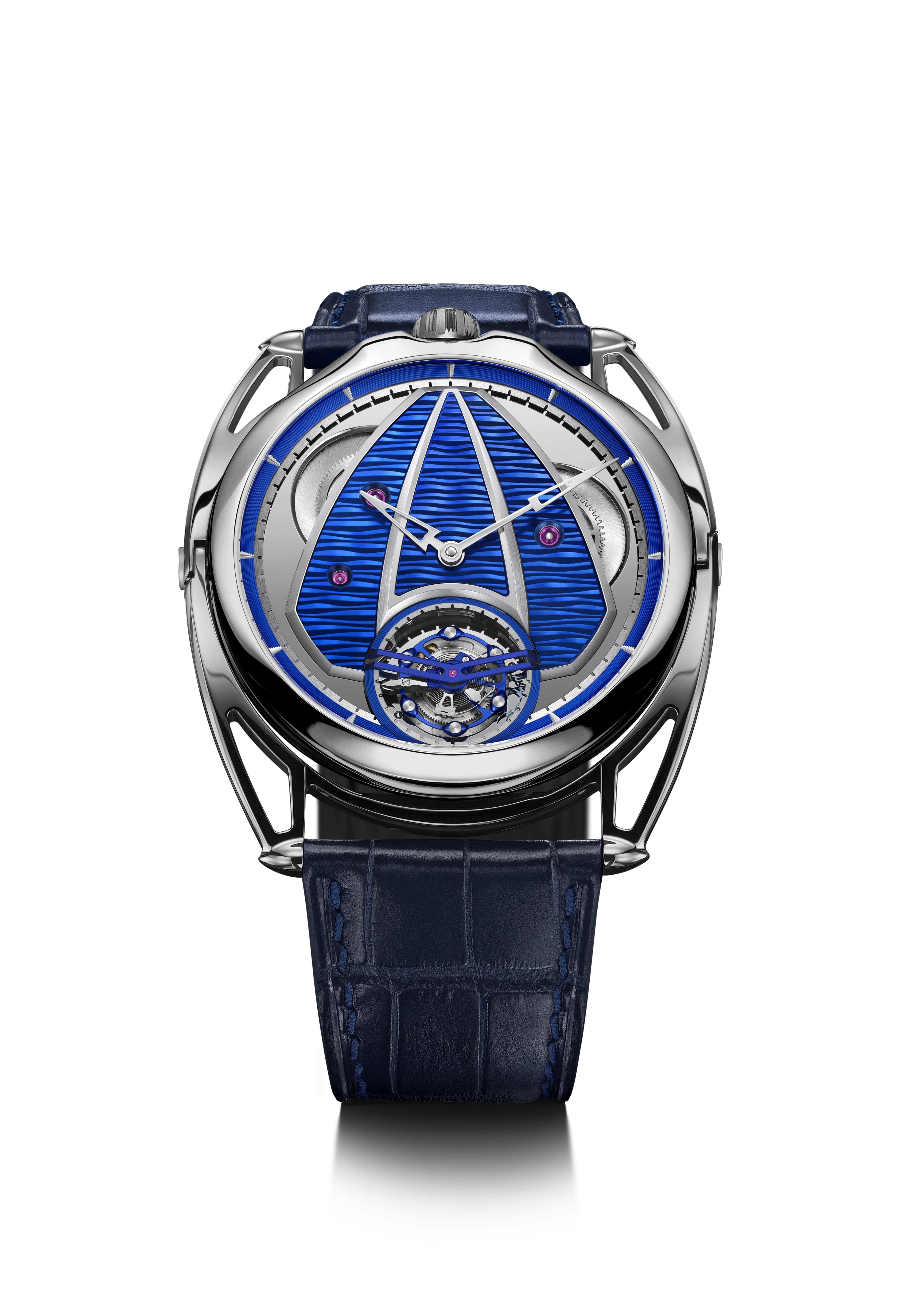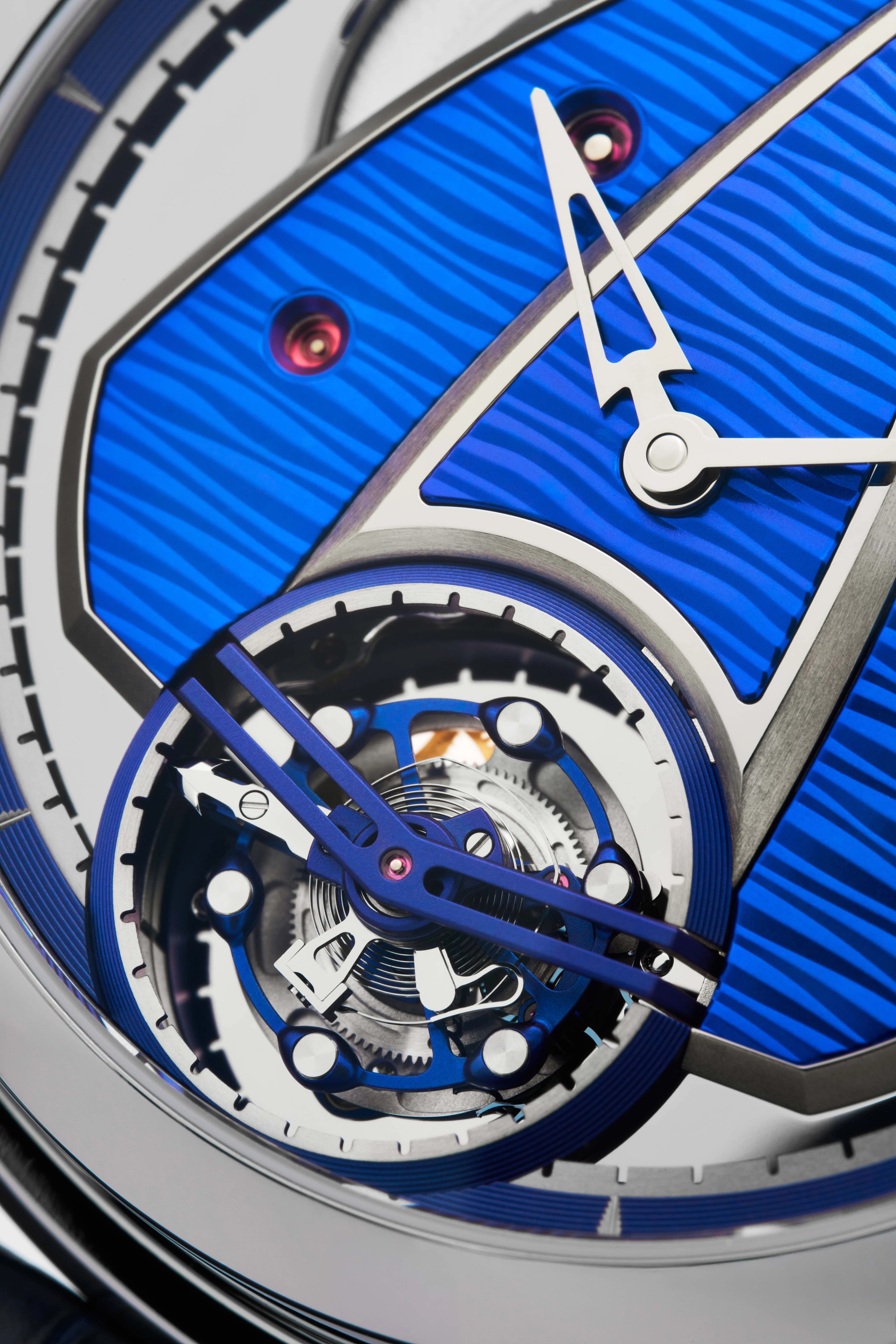 In advance of its upcoming tour showcasing its 2026 collections, De Bethune announced the DB28xs Sea Tourbillon, powered by caliber DB2009V7, which features a high-frequency tourbillon, beating at 36,000 vibrations per hour and completing a full rotation in 30 seconds. The movement is ultra-light, weighing just 0.18g. The 39mm mirror-polished titanium case frames a blued titanium dial with a random guilloché pattern that evokes the depths and waves of the sea. The DB28xs is priced at $210,000.