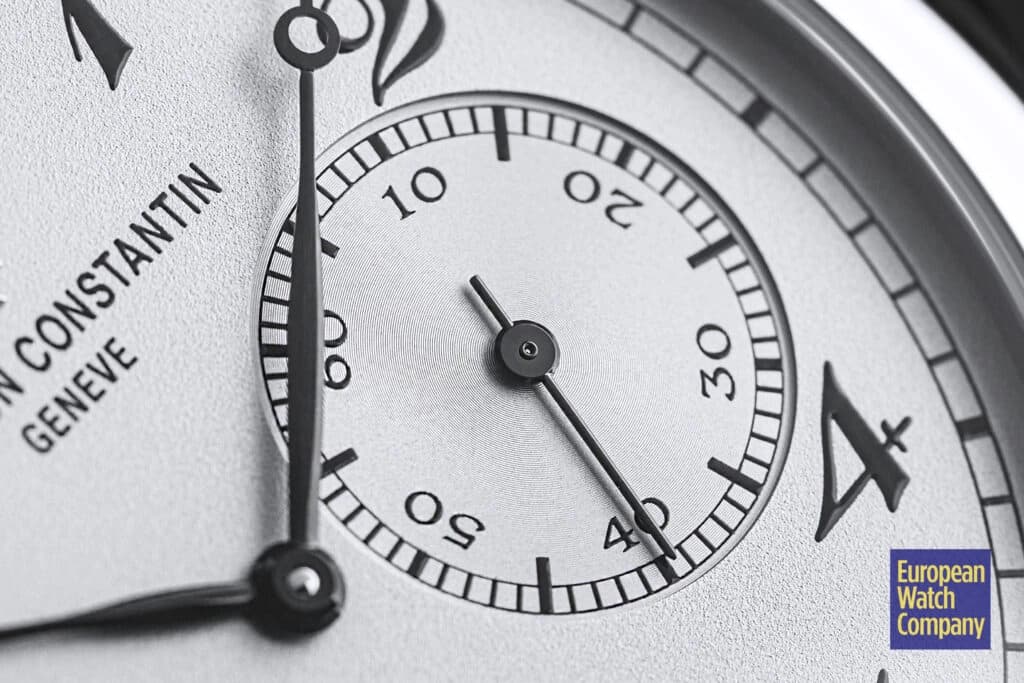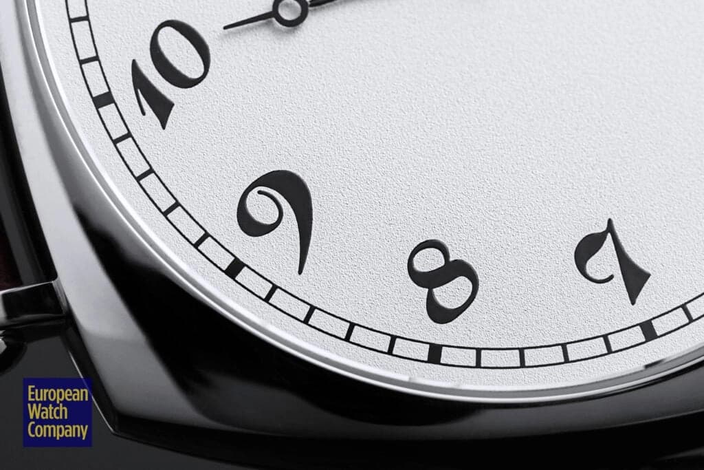 The dial is the star, though one that doesn’t outshine any other feature. Seen through a domed sapphire crystal, frosted silver plays host to a rotated 12-hour dial with highly stylized Breguet numerals, printed in black and capturing the Art Deco era of the original models. At 4 o’clock (or I suppose 3 o’clock on this dial), a sunken subsidiary seconds may seem typical at a glance, but note that it’s oriented normally against the 45 degree rotation of the rest of the dial. It’s hard to imagine what the rationale was here: it disrupts the entire gimmick of the watch, and if you’ve got this watch on wrist, it means you need to read it at two different angles. There’s also no mechanical reason to keep the seconds dial unrotated. Moving on, at 12 o’clock we find the brand name and an applied white gold logo. Surrounding both the main dial and the subsidiary dial are railway-style chapter rings. Tying it all together are glossy Breguet hands.