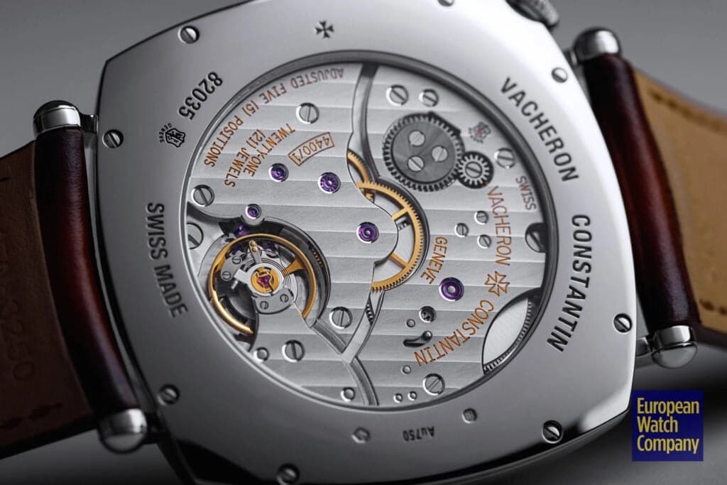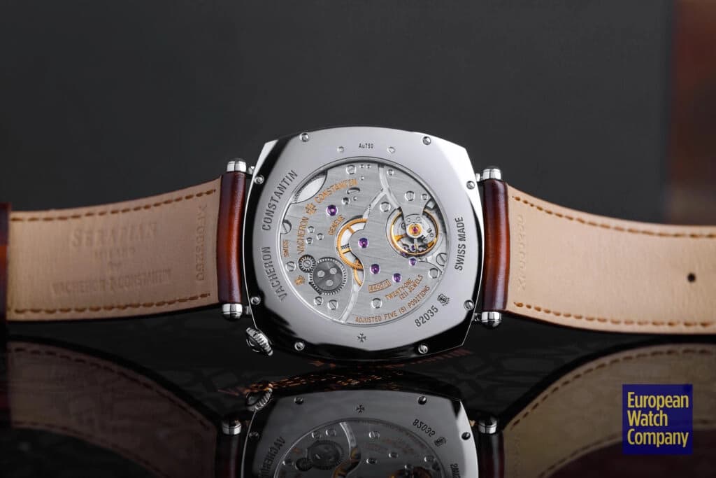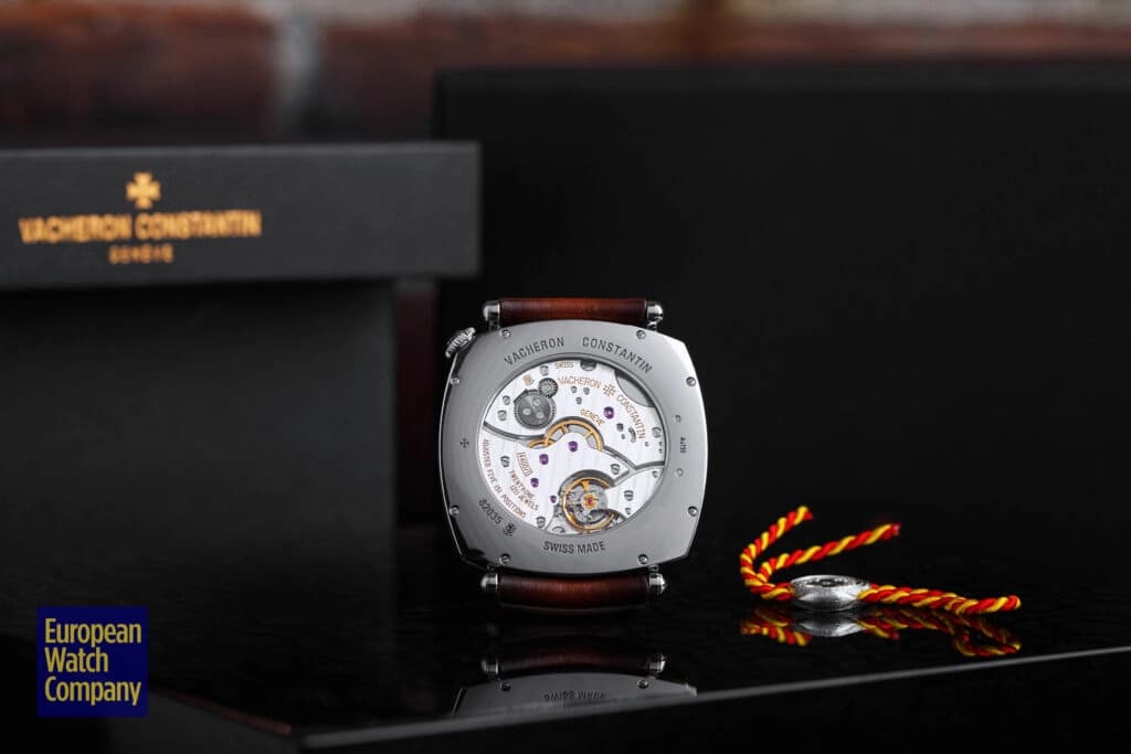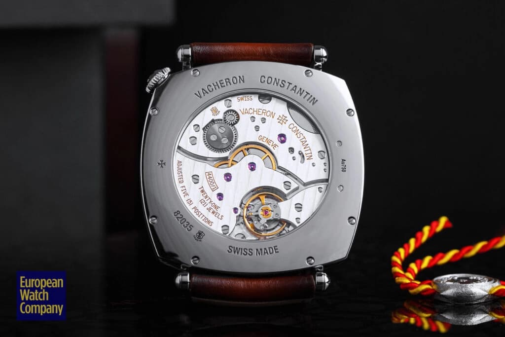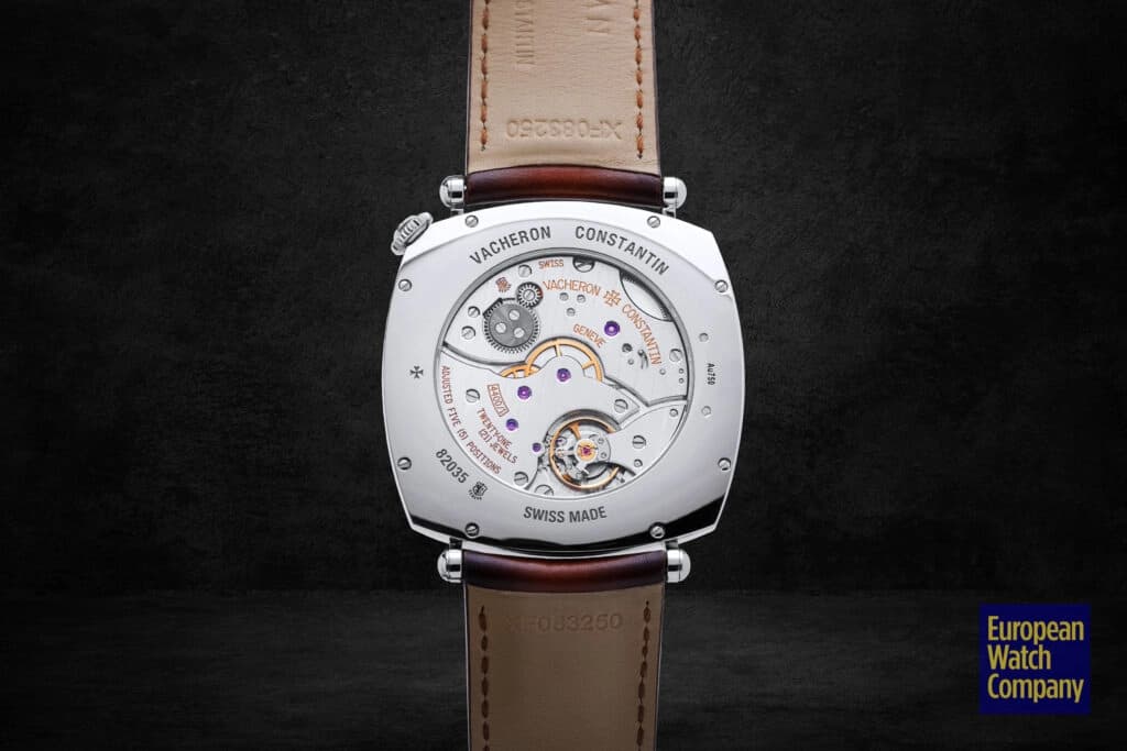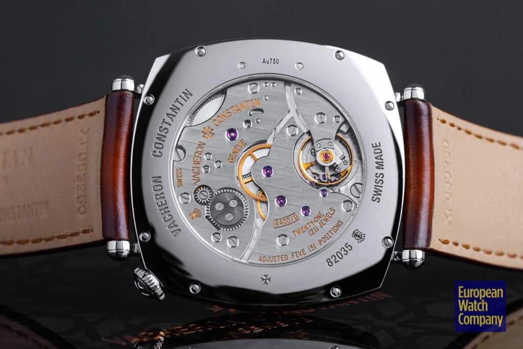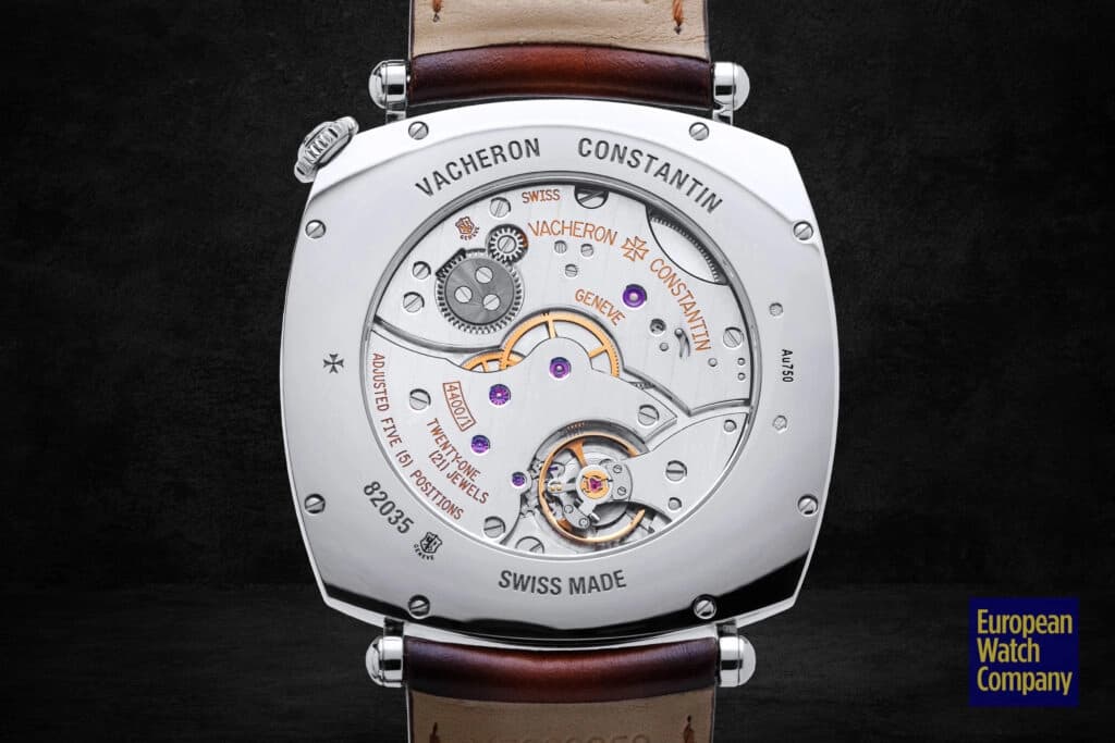 The movement was developed in 2008 in advance of the original release of the Historiques American 1921 and is offset from the typical central axis by 45°, allowing for the unique configuration on the dial side. The caliber is made up of 127 components, features a flat balance spring, vibrates at 4hz, and is regulated in five positions.