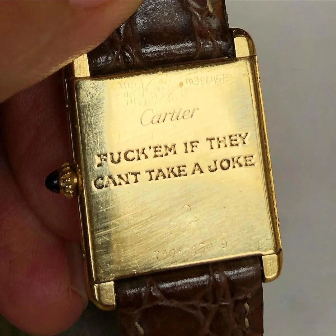 A second example revealed a very different kind of attachment. Coblitz pointed to a gold Cartier Tank engraved with the phrase “F*** ’em if they can’t take a joke.” “It’s less the watch and more the inscription that really makes it for me,” he said. The appeal, he explained, lay in the humor and intent behind the engraving. “I’ve always valued adding copious amounts of humor to more serious situations and appreciate others with that sense of humor.”